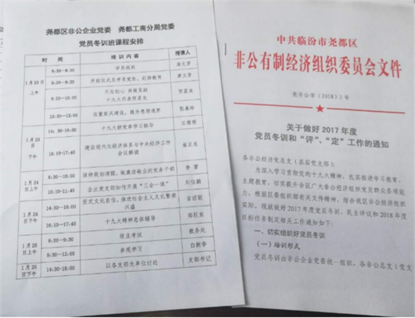 2018年1月23日,中共臨汾市堯都區(qū)非公有制經(jīng)濟組織委員會,開展關(guān)于做好2017年度黨員冬訓(xùn)和“評”、“定”工作學(xué)習(xí)會議,我公司積極參與了學(xué)習(xí),并在進一步貫徹落實中。