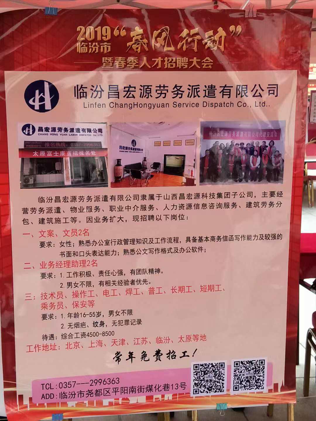 近日,昌宏源勞務(wù)派遣有限公司分別在臨汾市九州廣場和襄汾丁陶廣場舉辦了“2019年春季人才招聘會”,公司全體員工參與了本次招聘會。
