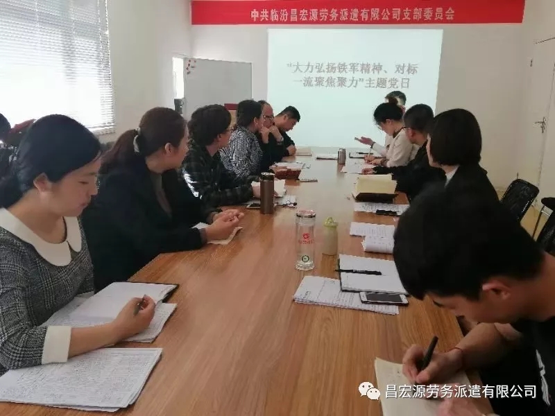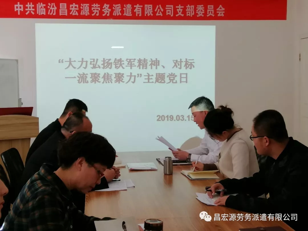 3月15日下午,臨汾昌宏源勞務派遣公司黨支部開展了“大力弘揚鐵軍精神、對標******聚焦聚力”為主題的黨日活動。