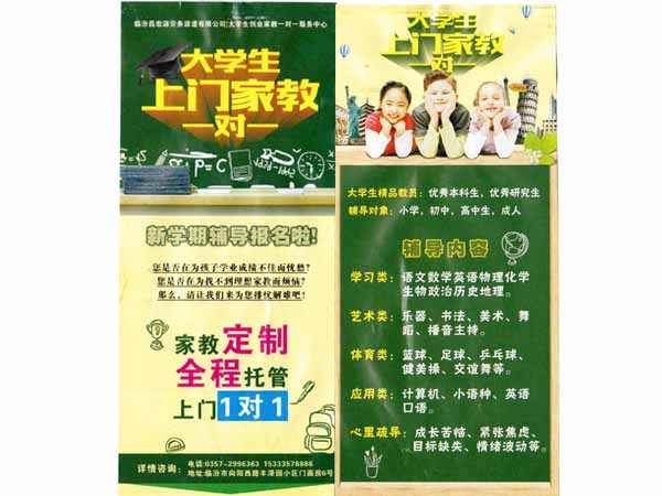 本公司常年進(jìn)行”一對(duì)一“小、中、高文化課和特長(zhǎng)等的輔導(dǎo)。我們公司薈萃了優(yōu)質(zhì)教師及各個(gè)名校大學(xué)生,幫助各年級(jí)學(xué)生在短時(shí)間內(nèi)掌握正確的學(xué)習(xí)方法,大幅度提高學(xué)習(xí)成績(jī),并養(yǎng)成良好的學(xué)習(xí)習(xí)慣。