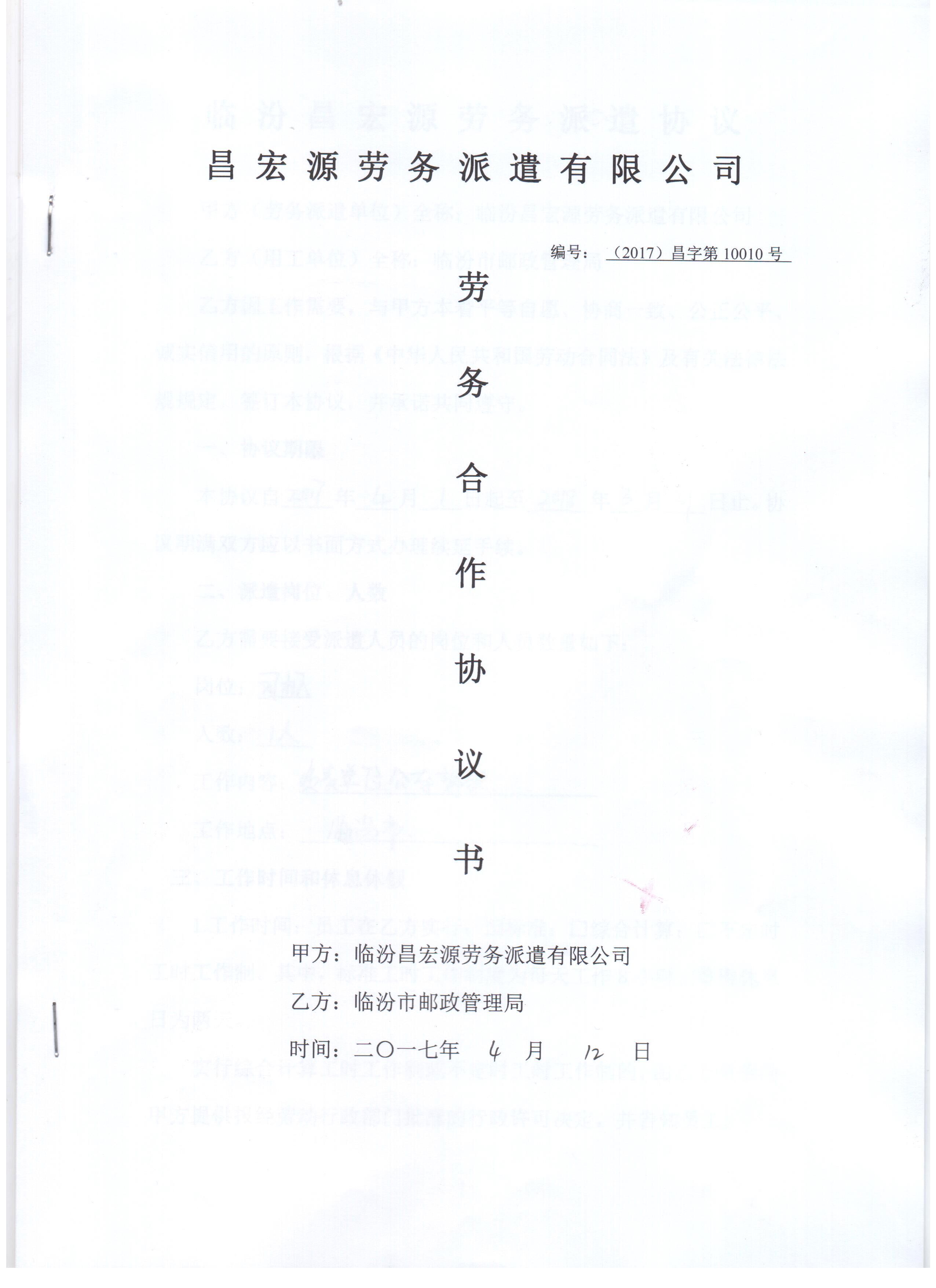 熱烈祝賀!臨汾昌宏源勞務派遣有限公司2017年4月12日在臨汾市郵政管理局服務項目中成功合作